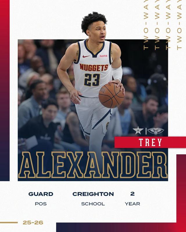 特雷-亚历山大是2024年落选秀,上赛季效力于掘金,打了24场比赛,场均1.3分。