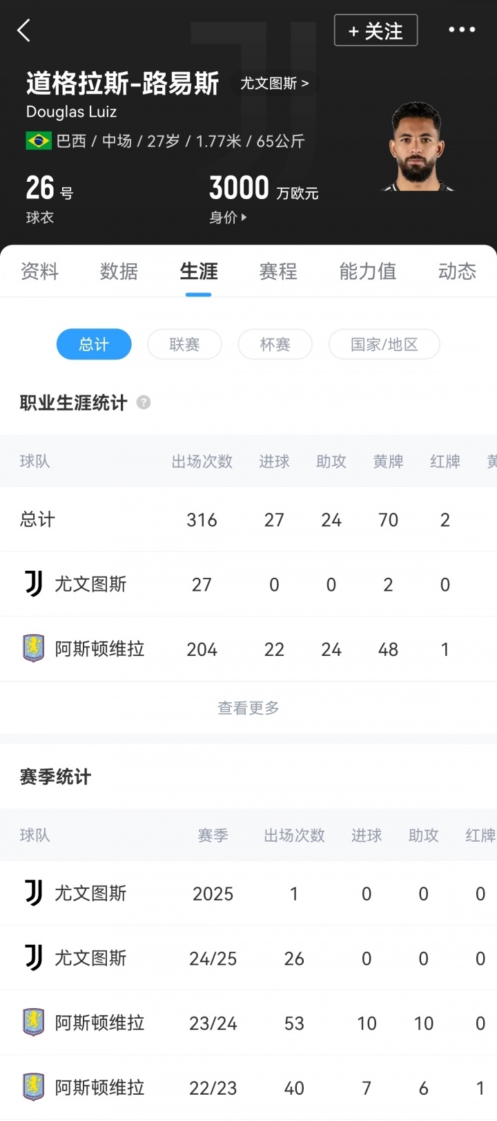 道格拉斯-路易斯于去年夏季转会窗以5150万欧元从维拉转会至尤文,但在2024/25赛季中,他仅出场26次,未有进球或助攻入账。